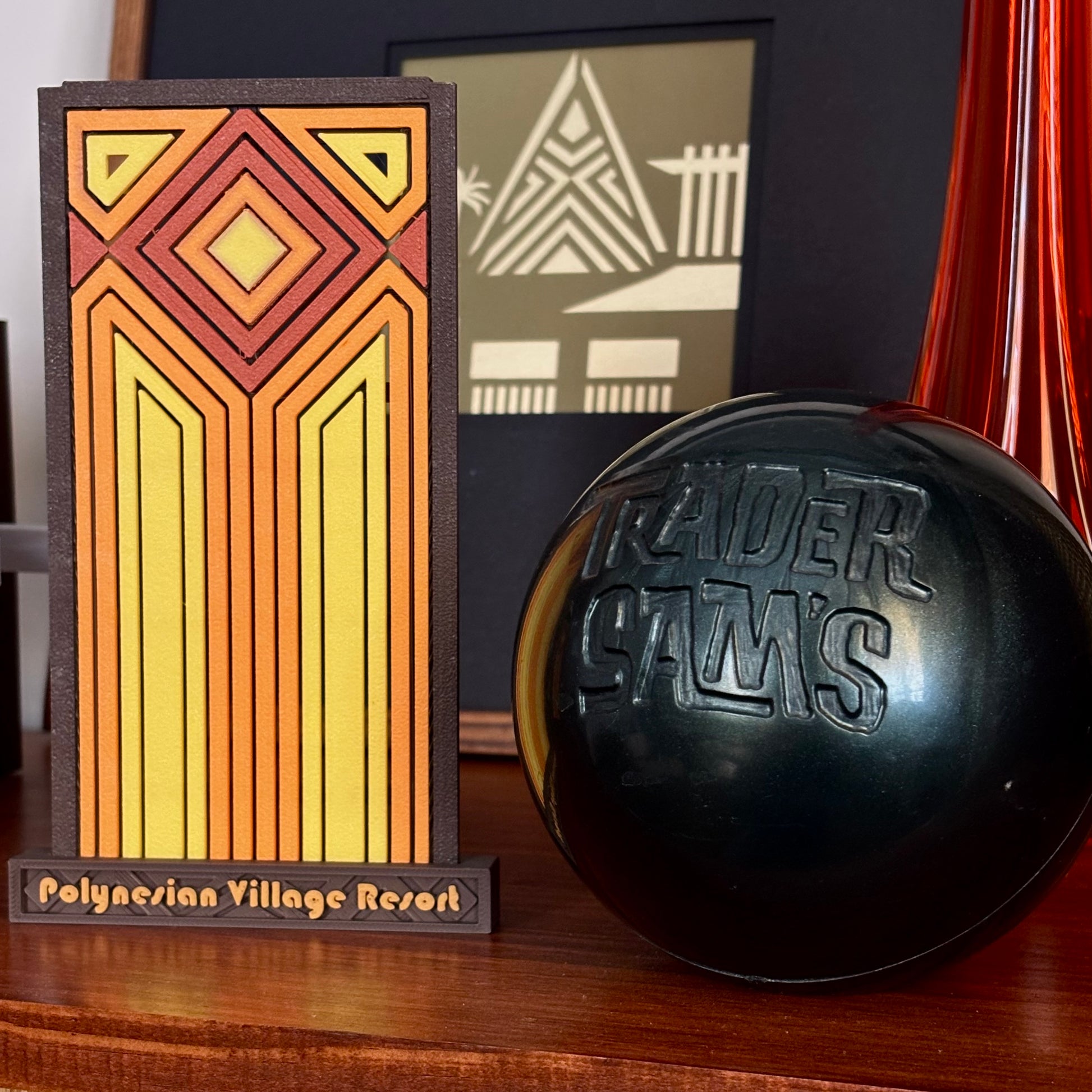 An elegant accent for a shelf, table or desk, this Polynesian Village Resort screen is inspired by the designs of the front entrance to the Great Ceremonial House.