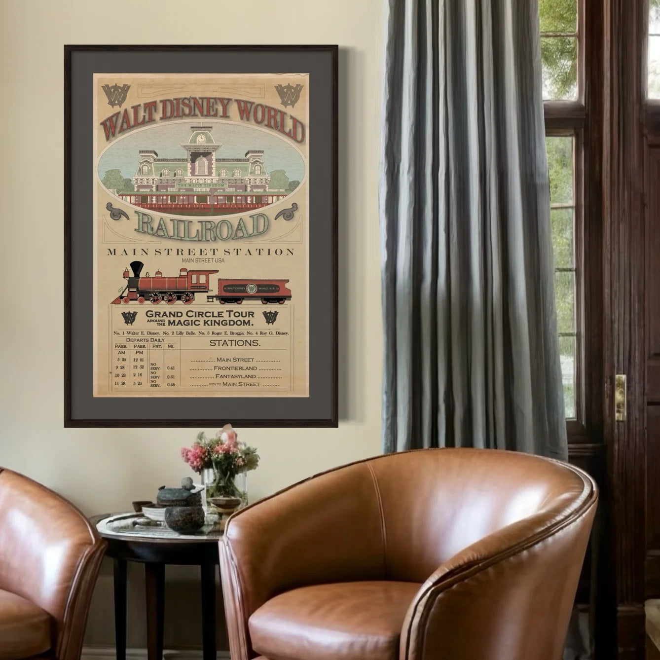 Experience the charm of yesteryear with the Walt Disney World Railroad Main Street Station Poster Art. This vintage-inspired design captures the nostalgic feel of the iconic station, beautifully reproduced in high-quality print. Add a touch of Disney magic to your space with this timeless piece of art.